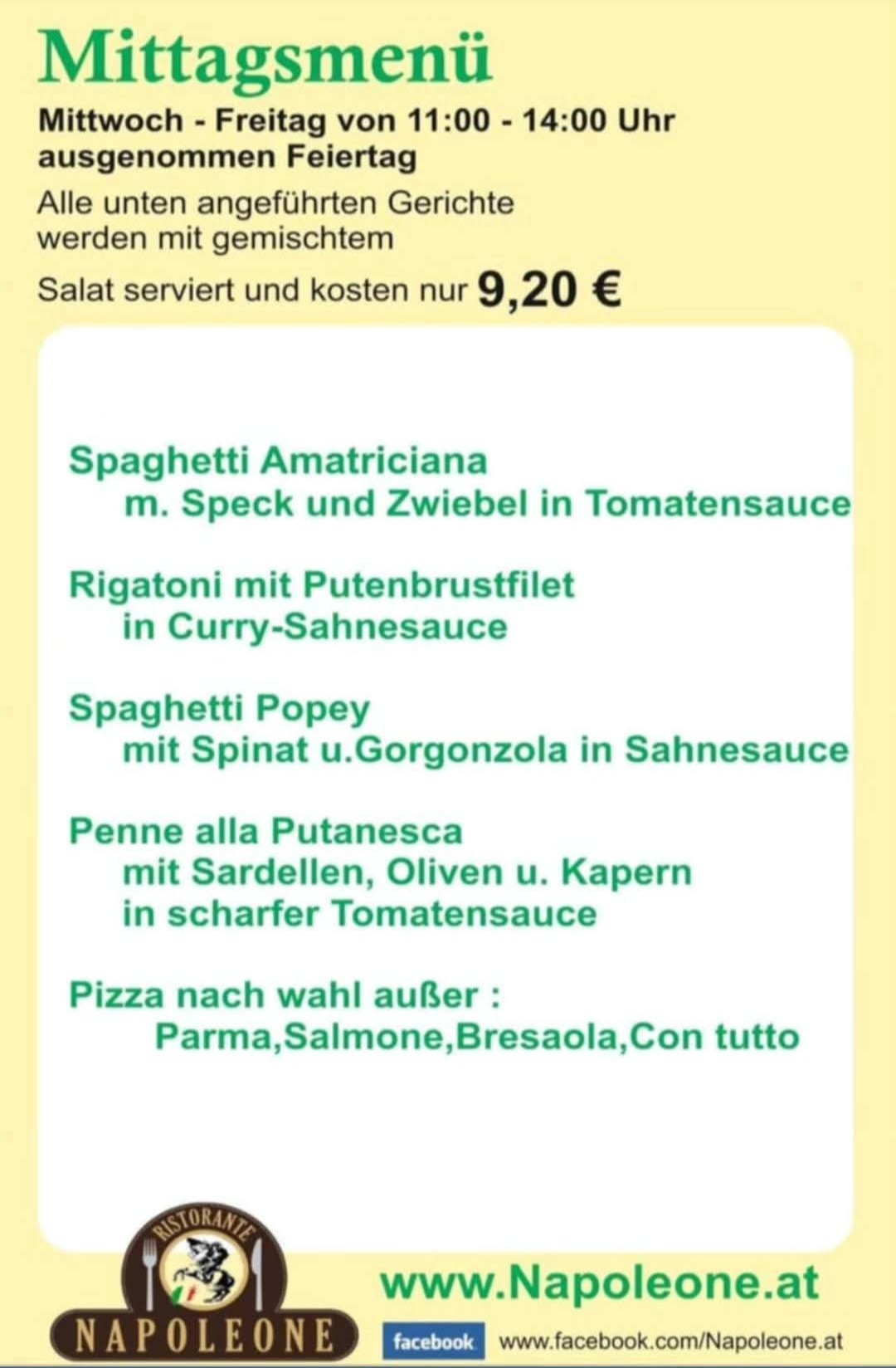 Unsere Mittagsmenüs ab 03.12.2025 Montag, Dienstag Ruhetag! MITTAGSKARTE Mittwoch bis Freitag von 11:30-14:00 Uhr (außer an Feiertagen) gibt’s unsere preiswerten Mittagsmenüs inkl. gemischtem Salat um nur € 9,20 !!!